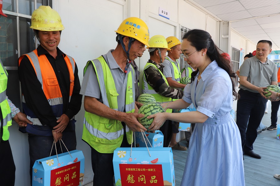 慰问现场,宋薇平代表四川省交通运输工会向项目一线职工和作业人员表达深切关怀,对他们在高温下坚守岗位和为项目建设作出的贡献表示衷心感谢和崇高敬意。随后,宋微平等人将西瓜、矿泉水、防暑降温礼包等物资送到一线职工和作业人员手中,并殷切叮嘱大家在坚守岗位的同时要注意防暑和安全,务必做好自我防护,时刻关注自身健康,以更充沛的精力和饱满的精神状态投入到工作中。