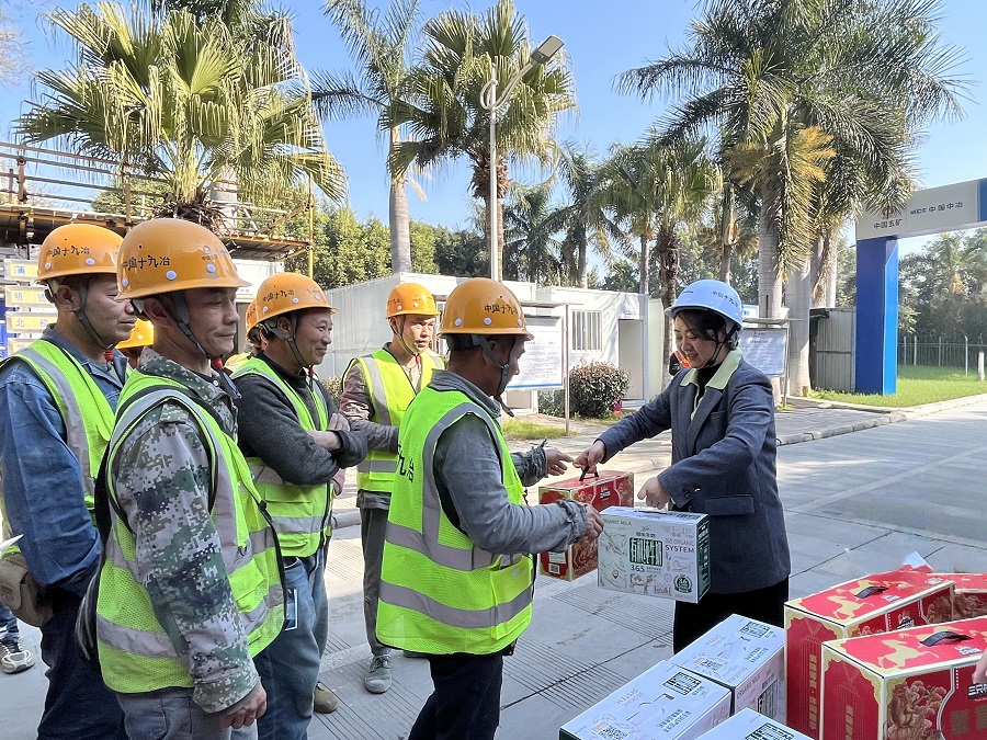 慰问中,两位领导充分肯定了项目建设团队传承三线精神,践行劳模精神与工匠精神的担当作为,并强调,该项目是攀枝花市工程建设的标杆和产教融合示范项目,项目管理团队要始终把安全生产放在首位,积极推广应用智能建造技术,严格落实农民工工资支付制度,全力确保项目优质高效交付。随后,杨平、凌莉一行向一线作业人员发放安全文明施工、防艾、禁毒等宣传资料,以及牛奶、坚果等慰问物资,并细心叮嘱大家要科学安排作业时间,注意劳逸结合,保持身心健康,以更加饱满的状态投入后续建设。